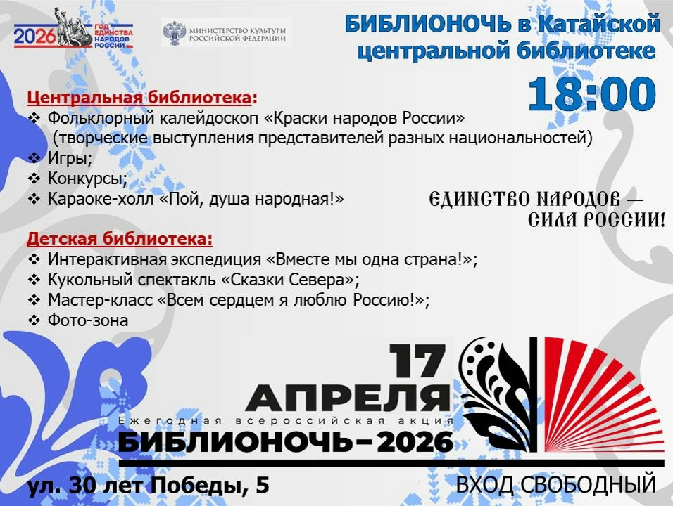 17 апреля в 18:00 в центральной и детской библиотеках состоится традиционная Всероссийская акция «Библионочь – 2026». Тема акции в этом году — «Единство народов — сила России!».