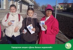 Сотрудники детской библиотеки и юный волонтер вышли на улицы города, чтобы рассказать его жителям об этом празднике, вручить его символ – белого журавля, сделанного из бумаги своими руками и информационные памятки об истории праздника.