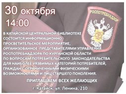 30 октября в 14:00 ч. в Катайской центральной библиотеке состоится информационно — просветительское мероприятие, организованное представителями Управления Роспотребнадзора по Курганской области по вопросам потребительского законодательства для наиболее уязвимых категорий потребителей, граждан с ограниченными физическими возможностями и лиц старшего поколения. ПРИГЛАШАЕМ ВСЕХ ЖЕЛАЮЩИХ.