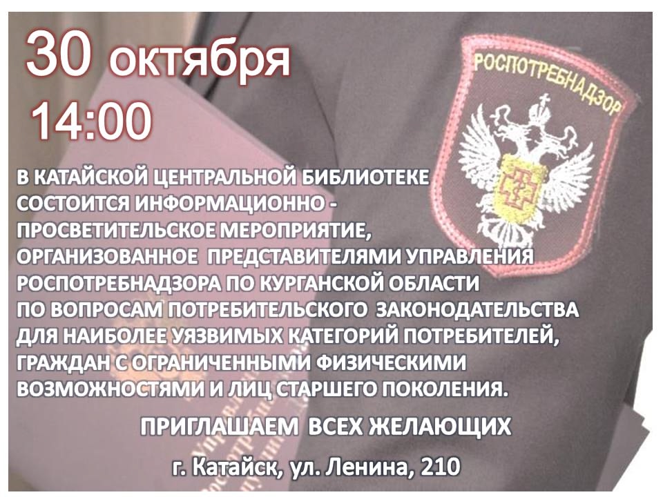 30 октября в 14:00 ч. в Катайской центральной библиотеке состоится информационно — просветительское мероприятие, организованное представителями Управления Роспотребнадзора по Курганской области по вопросам потребительского законодательства для наиболее уязвимых категорий потребителей, граждан с ограниченными физическими возможностями и лиц старшего поколения. ПРИГЛАШАЕМ ВСЕХ ЖЕЛАЮЩИХ.Мы ждем вас по адресу: г. Катайск, ул. Ленина, 210 (Управление образования 1 этаж).